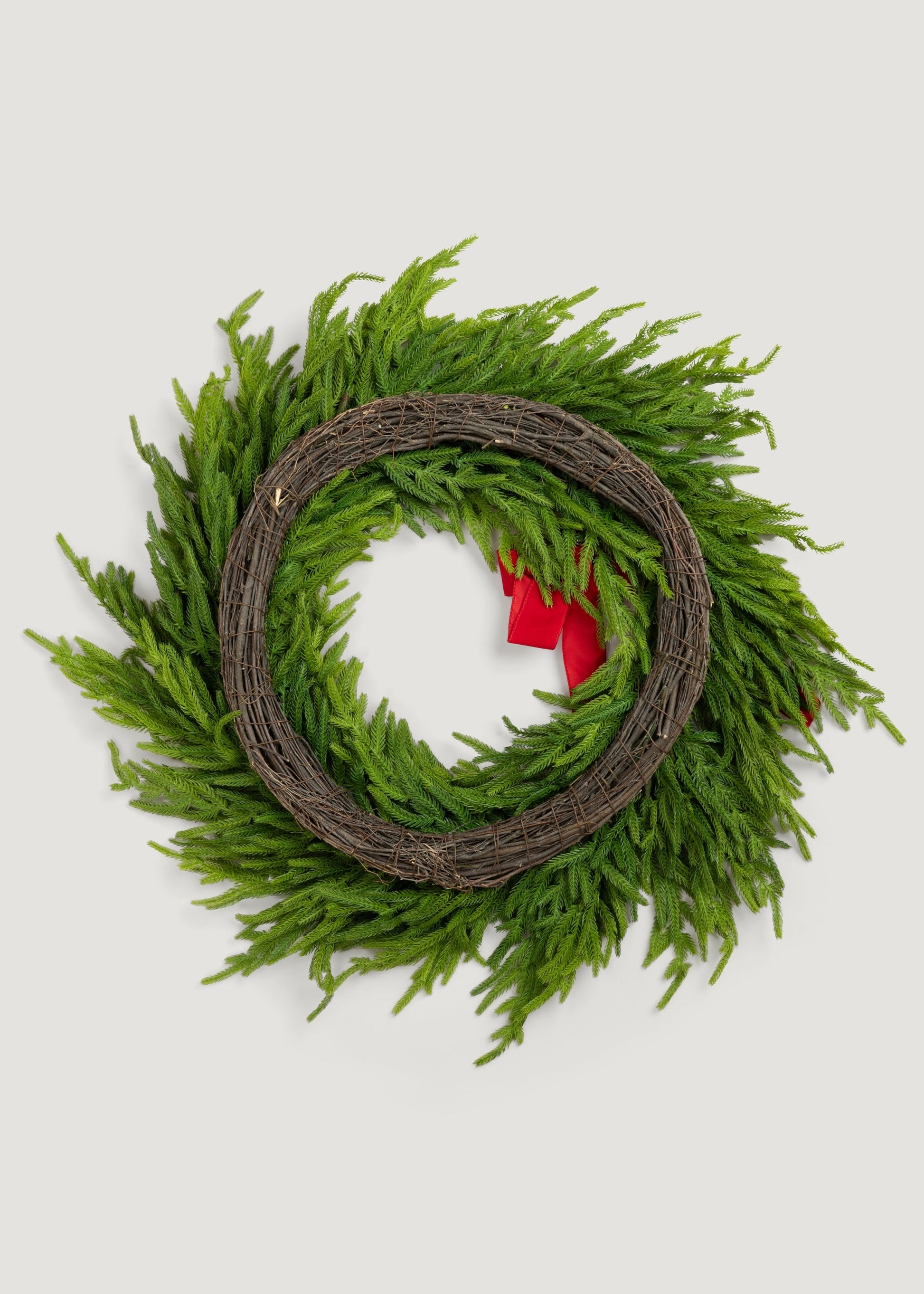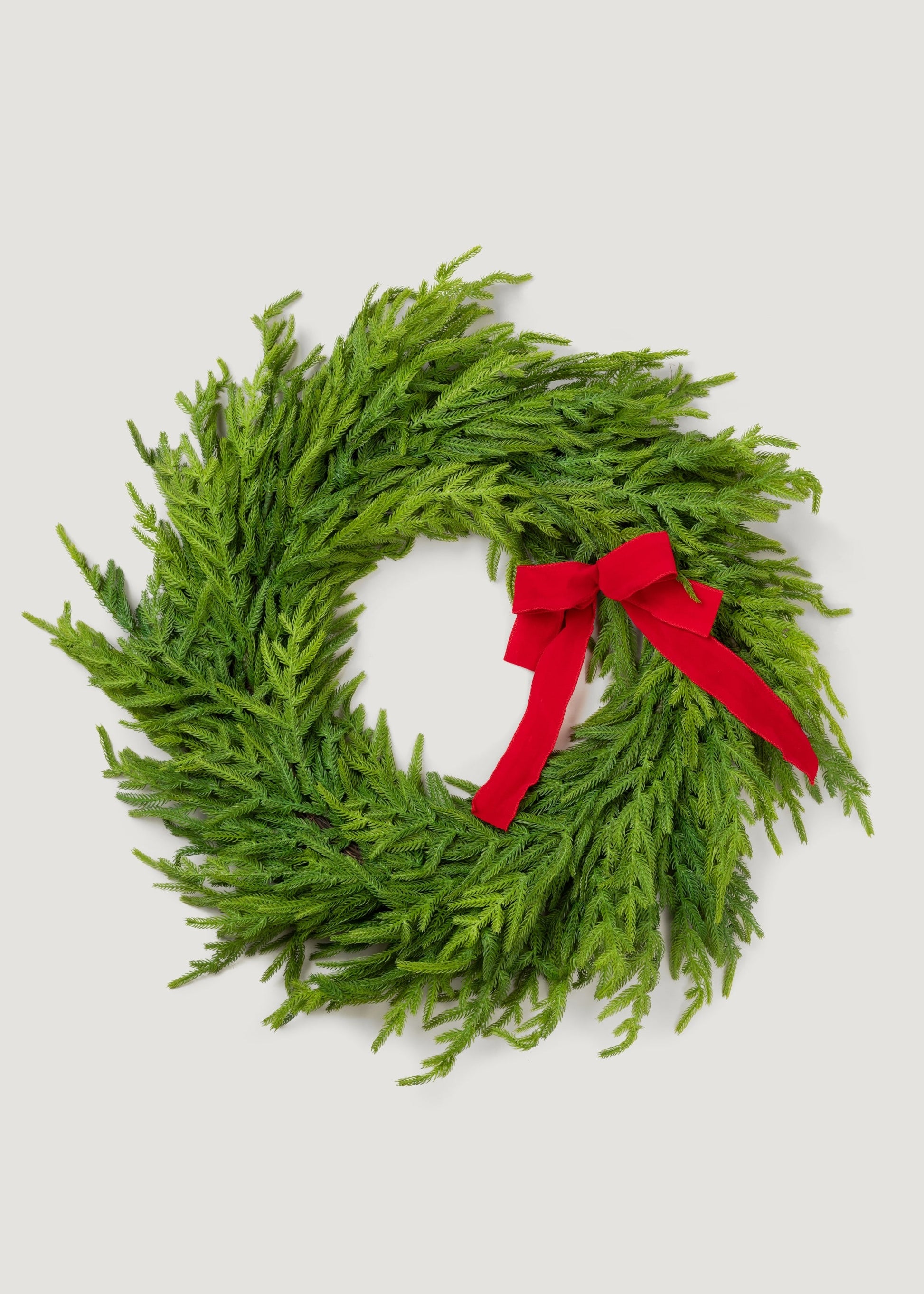 Our ever-popular natural touch artificial winter Norfolk pine wreath is now available in a larger and fuller version! Featuring a bow and more lush green real touch fake foliage, it's the perfect lifelike Christmas wreath that infuses holiday joy into your home's interior spaces. Hang it on your door or the wall above your mantel, and the result is a nature-inspired faux greenery centerpiece that offers permanent freshness all season long.
