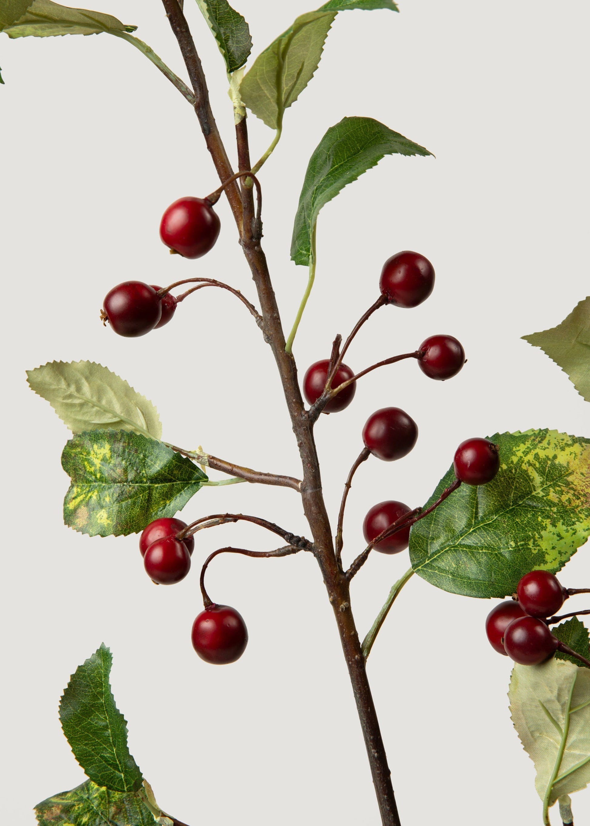 The perfect botanical accent for transitional styling, this beautiful red artificial crabapple fruit branch is just what you need to turn your fall floral arrangement into a winter look. With realistic red crabapples and green leaf foliage, this faux berry fruit branch welcomes nature into your home and captures the beauty of seasons changing. Add these berries and leaves to a vase design and instantly create a holiday-ready centerpiece!